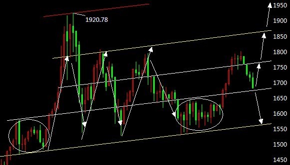 这是周线图,大家可以直观看到这个1550-1850大通道。前期横盘三个月上冲1795回踩1670附近,现在预测后期行情,黄金价格是继续下1630-1600的可能大?还是反弹1760的可能大?