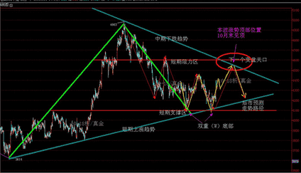 图示是我们上月中旬给出的后市预测,截至目前行情一直按我们的预期步步运行。虽然行情于10月份的反弹幅度达50%,但是最终在中期趋势阻力及黄金分割比例61.8%下方受阻,并于上周三美联储议息当晚形成反转,使得金银拉开了首轮冬季跌势的序幕。周线上,黄金价格和白银价格重回支撑线附近,显示中期多头力量的不足;日线大跌形成断头铡刀之势,短线多头可谓一败涂地,为后市奠定了明显的空头优势格局。本周非农能够扭转短线格局,值得期待。