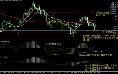 黄金价格回落两个阶段性位置,第一回落位置1305-1292区间,因为非农意外走高次支撑位置已经告破。那么第二阶段分析师看1255-75区间。这也是前期下跌得到支撑的颈线位置。macd看也是处于选择方向,平滑线位置0轴。而绿色的macd则显示可能正在酝酿筑底形态。若是目前阶段筑底走高,上涨阻力则看1372美元,国际黄金未能站稳1372美元就不能言多头成功反弹。