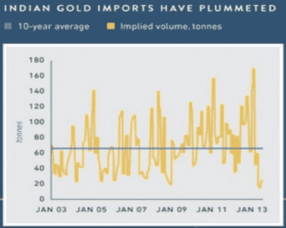 (绿线=印度黄金进口10年均值 橙线=进口规模变化[公吨])