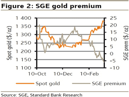 (上海黄金交易所溢价变化 黄线=金价 灰线=SGE溢价)