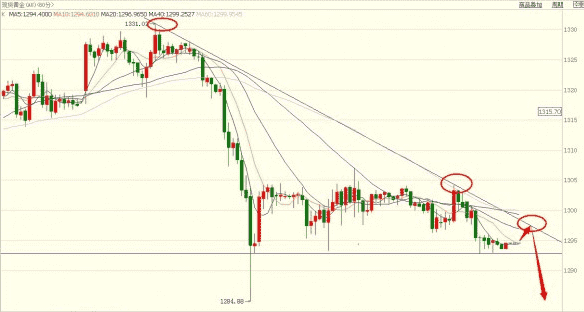 那么,国际黄金周四的行情下探至1293之后反弹1294附近收官,收于小时线5日均线下面,从下降通道来看,黄金价格周一直接下跌或小幅反弹再下跌的可能性非常大,这是一种捡钱的节奏。