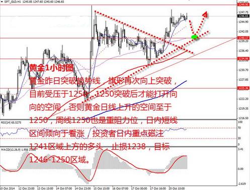 昨日黄金现货突破趋势线,旗形再次向上突破,目前受压于1250,1250突破后才能打开向向的空间,否则伦敦金日线上升的空间至于1250,周线1250也是重阻力位。