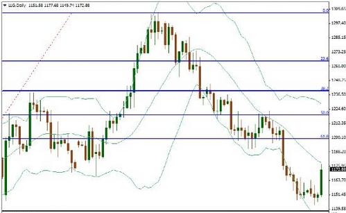 虽然昨天黄金价格出现了明显的涨势,月线图上国际黄金价格只是出现了小幅的反弹即K线支撑1145后的反弹,没有较大的改变任何的趋势。