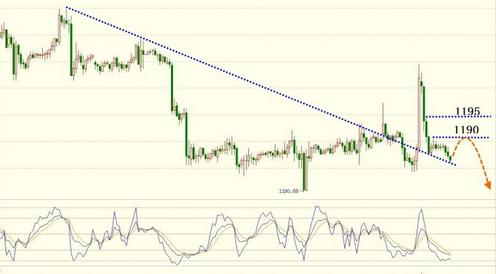 从4小时图来看,千二上方极强的阻力不容多头撼动,短期的支撑平台就在1180-1170区间内,日内1185为短线弱支撑,料将先测试其支撑有效性而进行盘整,大区间破位还需本周非农指引。