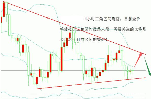 从目前震荡区间来看,黄金价格已经运行于三角震荡区间末段,而国际金价也是急需等待三角区间破位对于目前方向进行重新选择。
