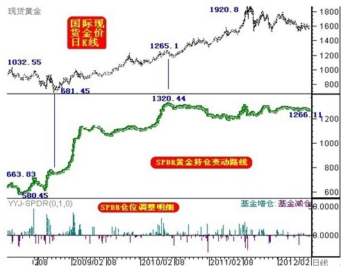 图中可以看出,SPDR最大的持仓量为2010年6月的1320.44吨,随后至今的两年,总体仓位调整不大。目前1266.11吨的最新持仓,仅相对于历史最大持仓减少54吨左右,幅度仅约4%。何来黄金ETF连续大幅减仓之说?何来黄金ETF对后市悲观之意蕴?相反,从黄金ETF的高度锁仓状态可以看出,其对黄金的中长期走势体现为乐观预期。当然,保证金投资者也不能凭此就无所畏惧地大肆转多,观其08年操作,金价从1032.55美元下跌至681.45美元过程中,SPDR总体体现为逆势增仓,如果保证金投资者此间参考其操作,无疑会相当被动。而随后三年的金价走势证明,SPDR的操作与持仓确实高瞻远瞩。故保证金交易与非保证金交易存在很大区别。从目前SPDR依然高仓位锁定持有黄金的战略意愿来看,非保证金投资者、金商等,维持多头持仓,或进行战略做多的策略无疑是正确的。