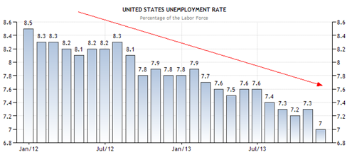美国11月失业率更是大幅降至7%,而此前美联储的预期是2013年底降至7%附近,目前来看就业市场的表现似乎好于市场预期。2008年发生金融危机后,失业率大幅飙升至10%附近,非农就业数据也跌入谷底。自2010年以来,失业率是稳步下降,同样利好美元。