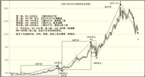 根据道氏理论的原理,黄金价格从2011年9月6日历史高位1920美元跌到2013年6月30日的1179美元,累计跌幅38%了,属熊市研究之内。如果时间和空间上吻合波浪理论的原理,1920美元应该是循环级浪的大三浪见顶了。