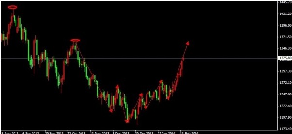 1、今日黄金价格1326轻仓追多,止损1323,目标1335。