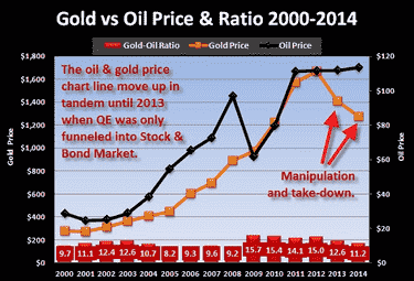 (红色为金价/油价;橙色为金价走势;黑色为原油价格走势)