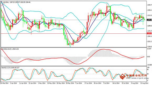 金鼎黄金网8月18日讯,上周五黄金价格先抑后扬,日线一根带长下影线的阴线收尾,日内黄金价格开盘1311.6美元/盎司,盘中最高价1314.6美元/盎司,最低价1292美元/盎司,收盘价1303.7美元/盎司。