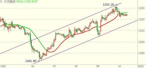 金鼎黄金网10月10日讯,隔日黄金价格周四全天走出小幅的震荡的行情,开盘价位在1223一线,早间形成在1225的高点受压之后形成小幅的回落,低点位在1218附近,之后亚欧盘便形成了慢涨的格局,最高点位在美盘开盘形成,1233点位,失业金公布利空黄金价格,黄金价格便下滑至1222一线受阻,最终收盘价位在1224一线。