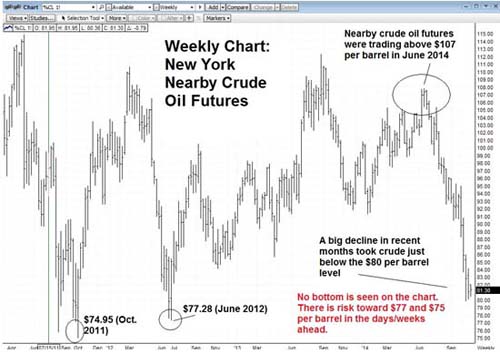 所以,我们在研究现货黄金价格后市走势的同时,也应该从技术图表上关心一下原油市场的走势。短期内,原油价格仍然存在着进一步下跌的空间,可以参考下图,在未来的几天或者几周内,原油价格将极有可能测试75美元一线的支撑。