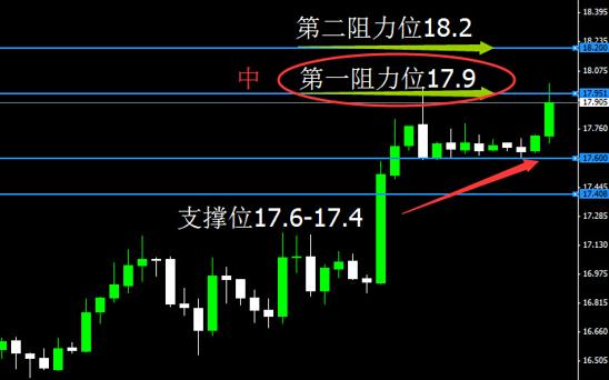 白银价格日线收小阳线,整体涨幅低于黄金,目前在18美元也需整固,盘中大支撑在17.5美元,黄金如顺利突破1300,现货白银则向18.3上方波动!如黄金震幅较大,白银则会出现慢跌波动!