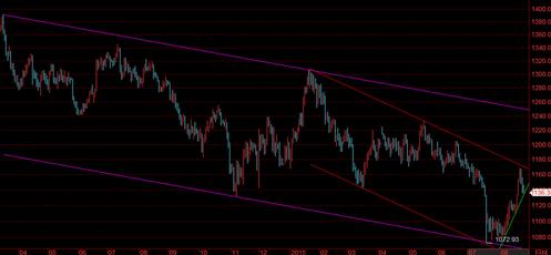 从周线大阳看出黄金价格下方空间不会太大,虽然昨天日线图大阴收线,但下影线为市场提供了良好的支撑性,1134作为前期关键阻力位,距离本轮行情上升趋势线越来越近,趋势线支撑已经上移至1130一线。