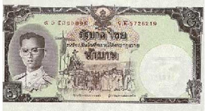 5泰铢面值图片正面图案是泰国国王于1963年,诞辰36周年时皇家巡游时的场景。背面图案是泰国国王中年时代的皇室活动等重大历史事件。