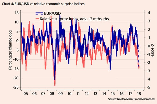 北欧联合银行(Nordea)分析师指出美元真的开始走向和基本面相符了。分析师称,上一次欧美的经济意外指数的差距像现在那么大还要回到2012年。如果仿照当时的货币走势,欧元兑美元在6月前会降至1.12。
