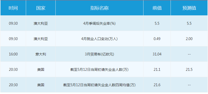 美盘时段,投资者需关注20:30公布的美国截至5月12日当周初请失业金人数、及美国截至5月12日当周初请失业金人数四周均值。