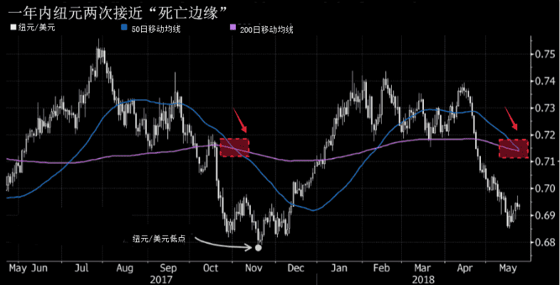 周三(5月23日)亚市盘中,纽元兑美元下跌近0.5%。新西兰央行发表了文件称“该央行并未预计官方现金利率将大幅下降”。尽管如此,在不到一年的时间里,纽元/美元再次构成“死亡交叉”——因其50天移动平均线低于200日移动均线。