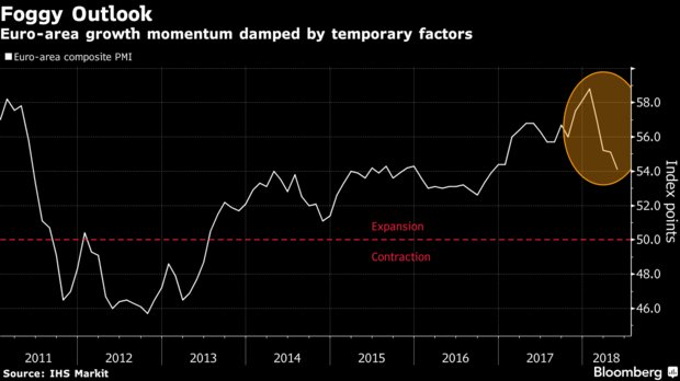 IHS Markit欧元区5月综合采购经理指数(PMI)初值降至18个月低点54.1,说明去年欧洲强劲增长的动能已有所丧失。