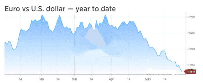 因意大利危机持续发酵,5月29日,欧洲金融市场全线下挫。欧元兑美元当天下跌0.7%,至1.15附近。美国股市同样大跌,道琼斯指数当天大跌逾450点。