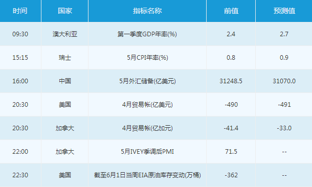 周三(6月6日)亚欧时段,投资者需关注09:30公布的澳大利亚第一季度GDP年率,15:15的瑞士5月CPI年率,及16:00公布的中国5月外汇储备。