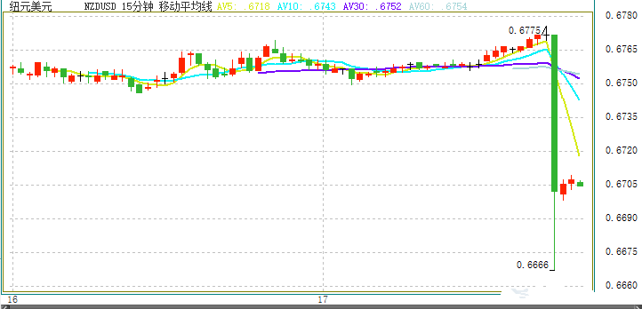 纽元/美元在出炉后一度暴跌逾百点,最低触及0.6666;数据公布前报0.6775。