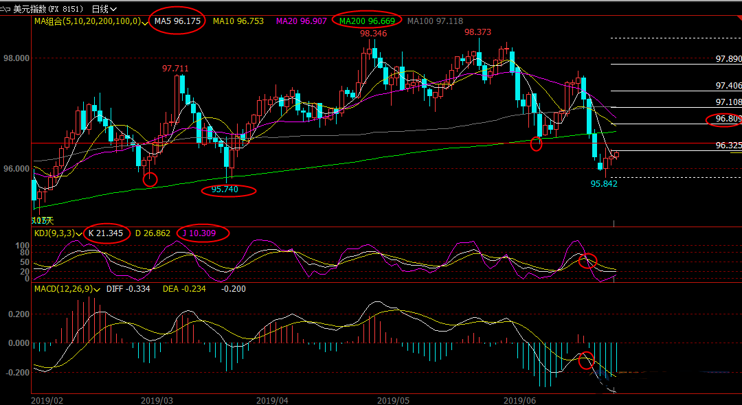 下方5日均线支撑目前在96.18附近,然后是96.00整数关口附近支撑,若意外回落至该位置下方,则增加重回跌势的风险。