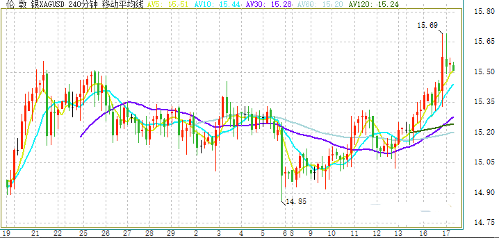 现货白银周二美市盘中最高上探至15.69美元/盎司,已跨越6月高点15.55美元/盎司,创出5个月以来的新高。