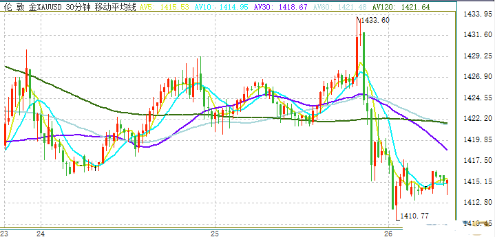 纽约时段,现货黄金则持续下跌,跌幅扩大至1%,自日高大跌逾20美元至1410.77美元/盎司。