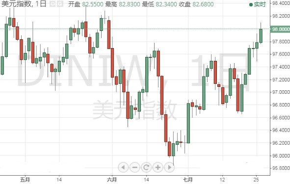 美国商务部周五公布的报告显示,美国二季度实际GDP年化季率初值增长2.1%,优于预期的增长1.8%。在优于预期的美国GDP数据出炉之后,美元短线震荡上涨,最高一度触及98.10。美元指数周五收盘位于98关口。