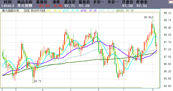 周二亚市尾盘,美元指数位于97.57附近。周二亚市早盘,美元指数最低一度触及97.20。美元指数近期已经自接近99水平明显回落。