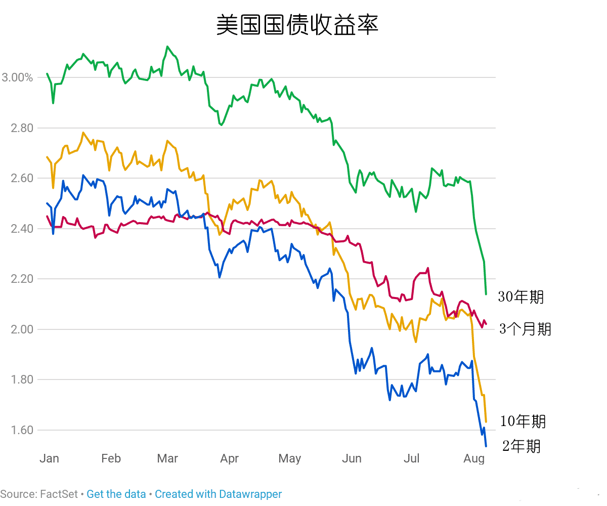 由于对全球经济放缓的担忧,以及多国央行的降息,10年期美债收益率本周三(8月7日)触及3年低点,基准国债收益率与3个月期国债收益率曲线倒挂,创下12年多来的最大幅度水平。尽管鲍威尔表示不会再次降息,但是美债收益率大幅下跌推高了市场对美联储降息的预期。
