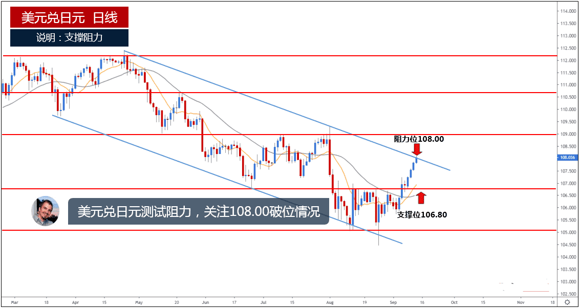 图为美元兑日元日线走势,价格持续走高,现正测试通道上轨108.00阻力位置。
