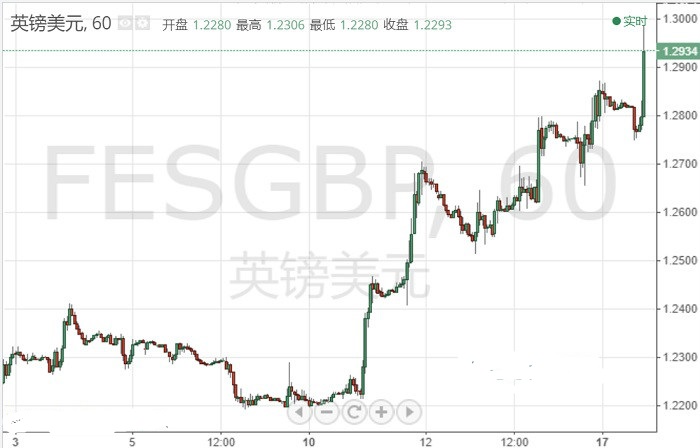 周四(10月17日)欧市盘中,英国脱欧传来最新一则重磅积极消息,英镑/美元短线突然进一步急剧走高触及1.2988高点,自日内低点1.2748已上涨240点。汇价逼近1.30关口,日内涨幅一度扩大至1.2%。而目前汇价再度冲高回落近60点至1.2930附近。