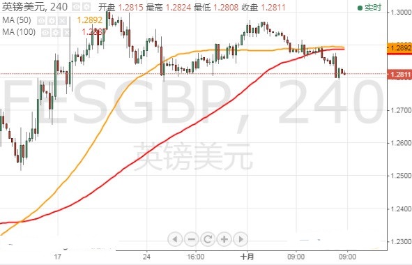 从4小时图来看,英镑/美元周四触及本月低点,交投在50 SMA和100 SMA下方。在跌破1.2821/1.2881支撑区域后,英镑/美元可能进一步跌向1.2730支撑水平。