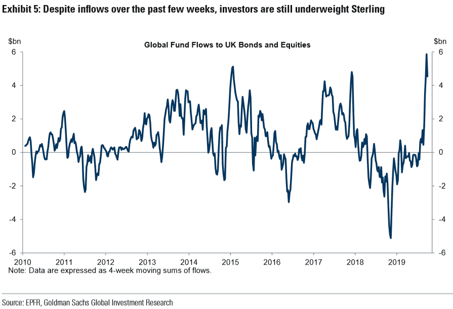 高盛表示,过去几个月,随着英国无协议脱欧的可能性降低,已经有大量资金回流英国,但这几乎没有影响到英镑实质性减持的整体前景