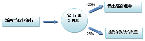 新西兰商业银行会基于中央银行给定的现金利率在50个基本点的区间内浮动,高于既定利率是借出,低于既定利率是接受公众存款。
