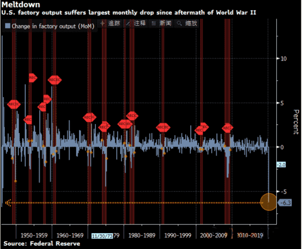 美联储数据显示,美国3月份工厂产值创下1946年以来的最大降幅。但是4月的调查数据看起来比3月更加糟糕, 纽约州制造业指数和美国住宅建筑商指数的下滑幅度都达到了以前无法想象的水平。