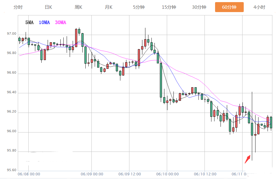 周四(6月11日)亚市盘中,美元指数弱势整理于96关口附近,周三(6月10日)美元指数延续跌势,盘中一度跌至95.71,为3月10以来最低,周四凌晨的美联储决议显示,决策者预计利率政策将保持不变到2022年;美联储声明发表后,美元兑欧元、英镑和瑞士法郎跌至三个月低点,兑日元跌至三周低点。