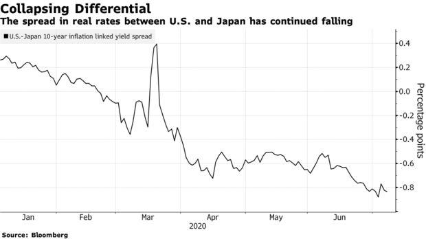 不过,这或许对日元不利。美联储为应对疫情而大幅降息,缩小了两国经济之间的利差。因为美联储暗示在2022年之前加息的或许性微乎其微,美元关于日元长时间持有的收益率优势或许难以康复。