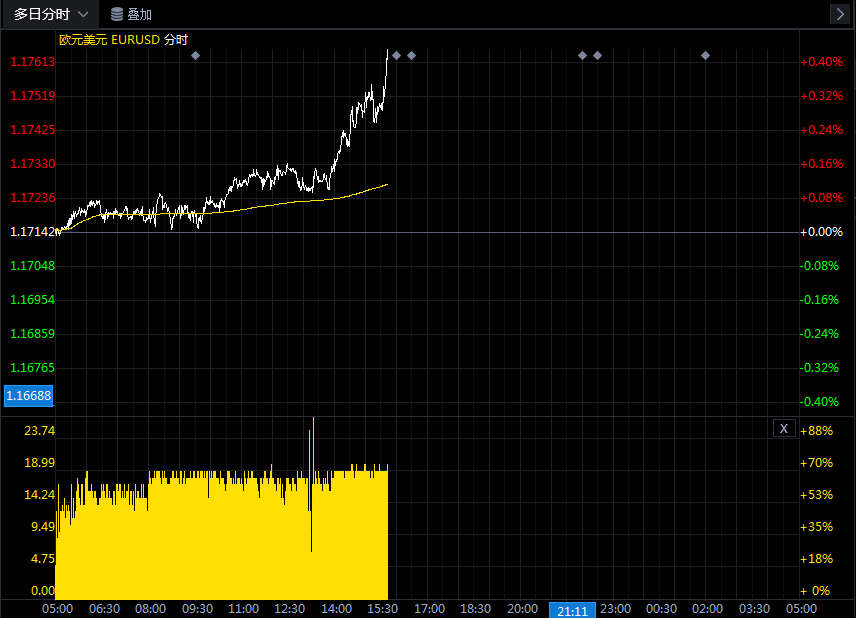 与此同时,非美钱银纷纷反弹,英镑兑美元GBP/USD走高最为强烈,逾30点,最高触及1.2977;欧元兑美元EUR/USD短线拉升近20点,最高触及1.177;澳元兑美元AUD/USD短线上扬20点,最高至0.7194。