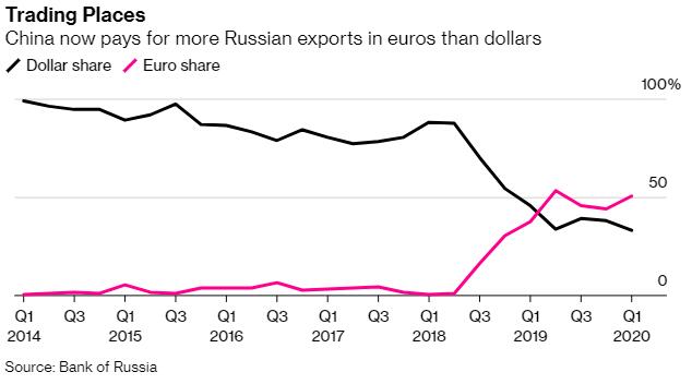 俄罗斯央行本月发布的数据显示,中国第一季购买的该国商品中刚好超过50%以欧元计价。数据还显示,俄罗斯对欧盟出口中以欧元结算的比例,也已从去年底的38%增加到了43%。