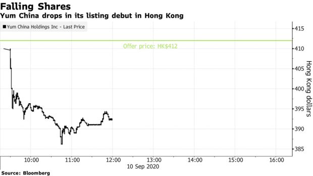百胜中国控股有限公司(百胜中国)香港上市首日大跌,此前该公司通过香港首次公开募股(IPO)筹资约22亿美元。百胜中国在中国经营肯德基(KFC)和必胜客(Pizza Hut)餐厅。百胜中国的开盘价略低于IPO发行价412港元(合53.16美元),随后在周四前市交易中继续下滑,最新跌4.9%,至392.00港元。该股上市首日走势疲软并不完全出乎意料。在交易开始前,百胜中国在耀才证券(Bright Smart Securities)和辉立证券(Phillip Securities)运营的暗盘市场中就已经下跌。