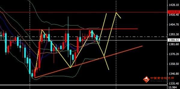 从目前的走势来看上方在1398-1400一线存在着较强的阻力,这一点在4小时线上体现得更为淋漓尽致,除了周三由于伯南克的发言使得当晚黄金价格突然拉升试探1414一线,又突然下降犹如过山车!其余的上攻均在该位置受阻,故1400有望成为短期走势的关键。