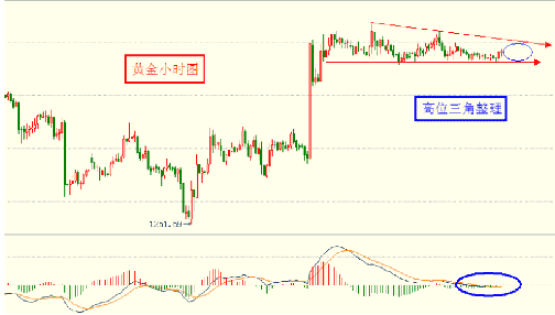 自上周四大涨之后,目前现货黄金处于高位三角整体,当然此图可以理解为下降三角形。但是为否真的有效还真需要不断确定。