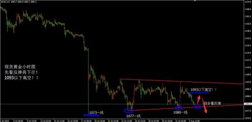 若黄金价格表现行情跌破1077一线则大底1073一线同样保不住,故要做多也只能是现在,下方关注三个支撑位置,都是低点支撑位置1080一线,1077一线以及1073一线。