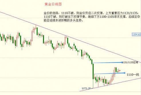 简单来看,目前黄金价格主要是依托前期压力转换水平支撑1110,同时这里也是本波反弹黄金分割0.618分位所在位置,经过测试可以看出此处支撑有效,极有可能担当起多头二次反弹的弹跳板。