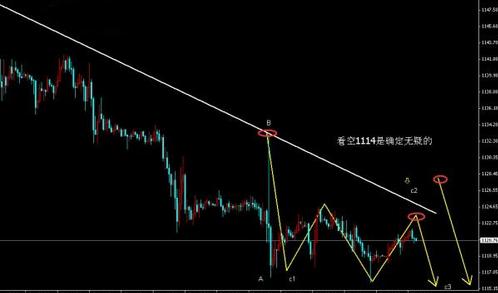 国际黄金价格高点连接1148-1132下行趋势线阻力位置,具体位置已下移至1124附近,但很显然的是反弹力度较小,交易不能死守位置,要根据具体的形势做小调整,前面1122附近的空单仍然建议持有,最低只到达1118一线,再次回升。